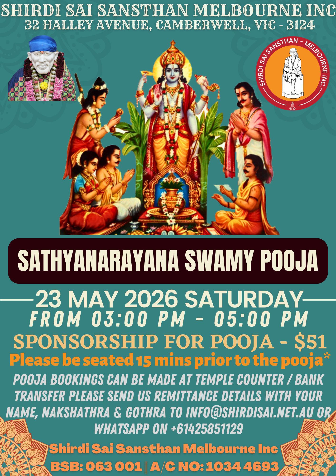 Shirdi Sai Sansthan Melbourne Inc., founded in 2005 is a registered charity organisation that engages in spreading Shirdi Sai Baba’s philosophy and teachings in Australia and throughout the world. Sai Baba taught the unity of all religions, universality of spirit in all existence and compassion for all living beings.