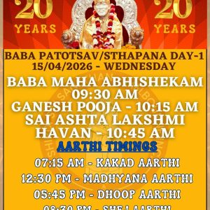 Celebrate 20 Years of SHIRDI SAI SANSTAN 10 May 5:30 pm - 8:00 pm Shirdi Sai Melbourne32 Halley Avenue Camberwell VIC 3124
