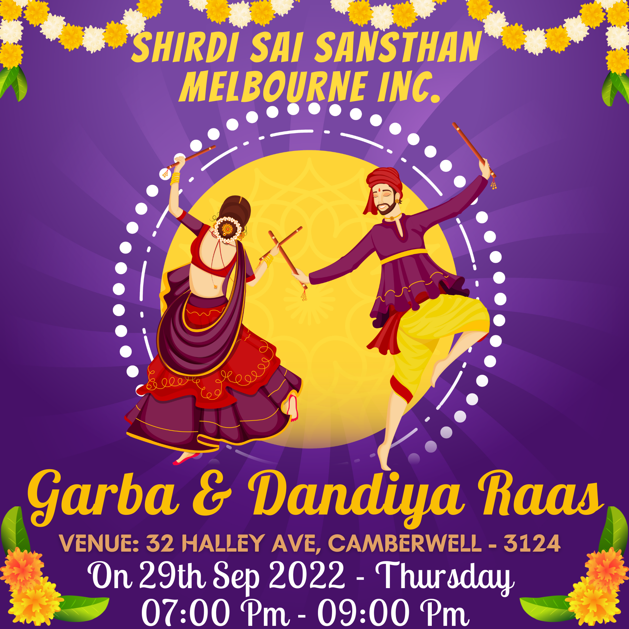 Garba & Dandiya Raas + Add to Google Calendar + iCal / Outlook export The event is finished. Date Sep 29 2022 Expired! Time 7:00 pm - 9:00 pm Location Shirdi Sai Melbourne 32 Halley Avenue Camberwell VIC 3124 Share this event