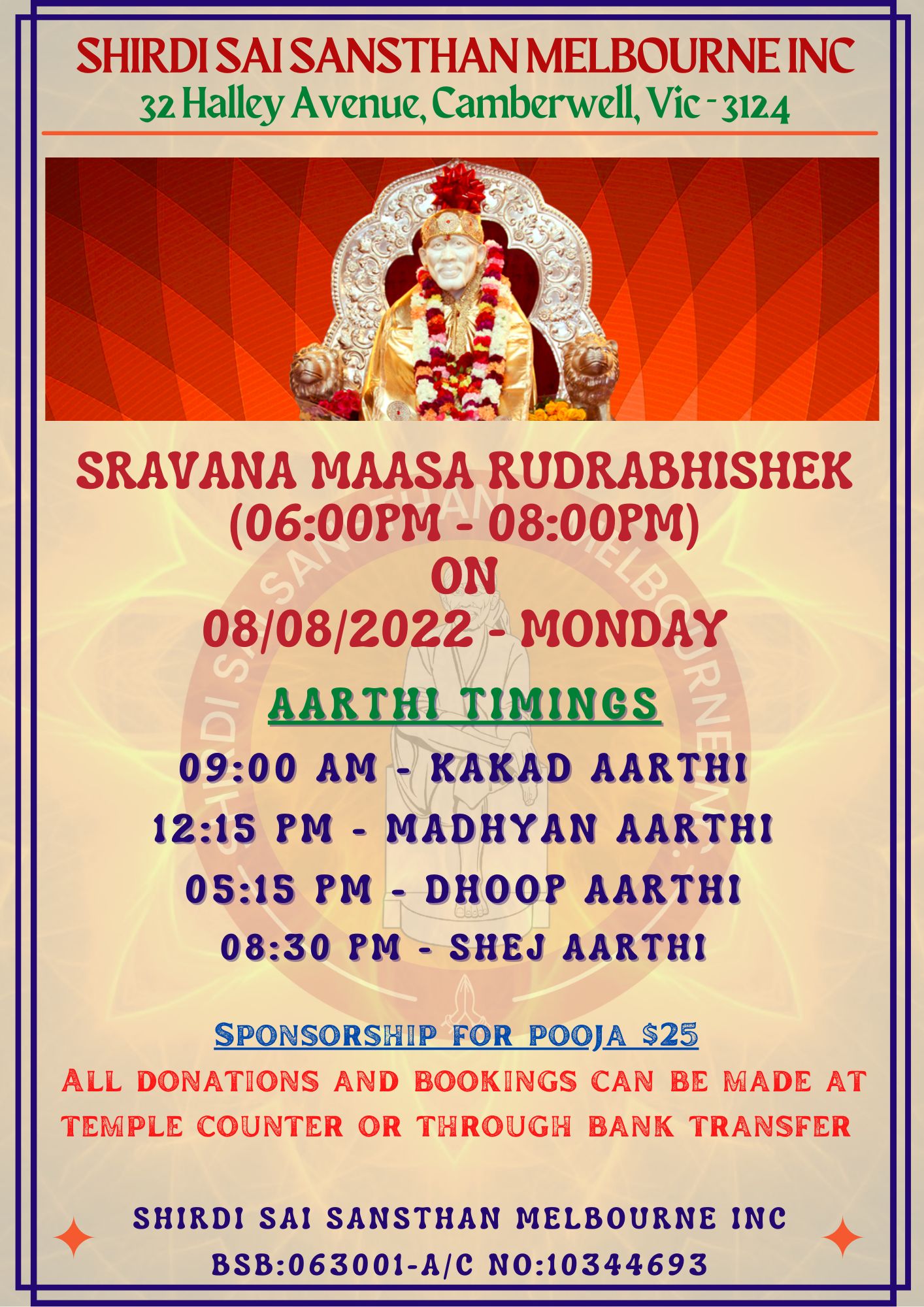 SRAVANA MAASA RUDRABHISHEK + Add to Google Calendar + iCal / Outlook export The event is finished. Date Aug 08 2022 Expired! Time 9:00 am - 8:30 pm Location Shirdi Sai Melbourne 32 Halley Avenue Camberwell VIC 3124 Share this event
