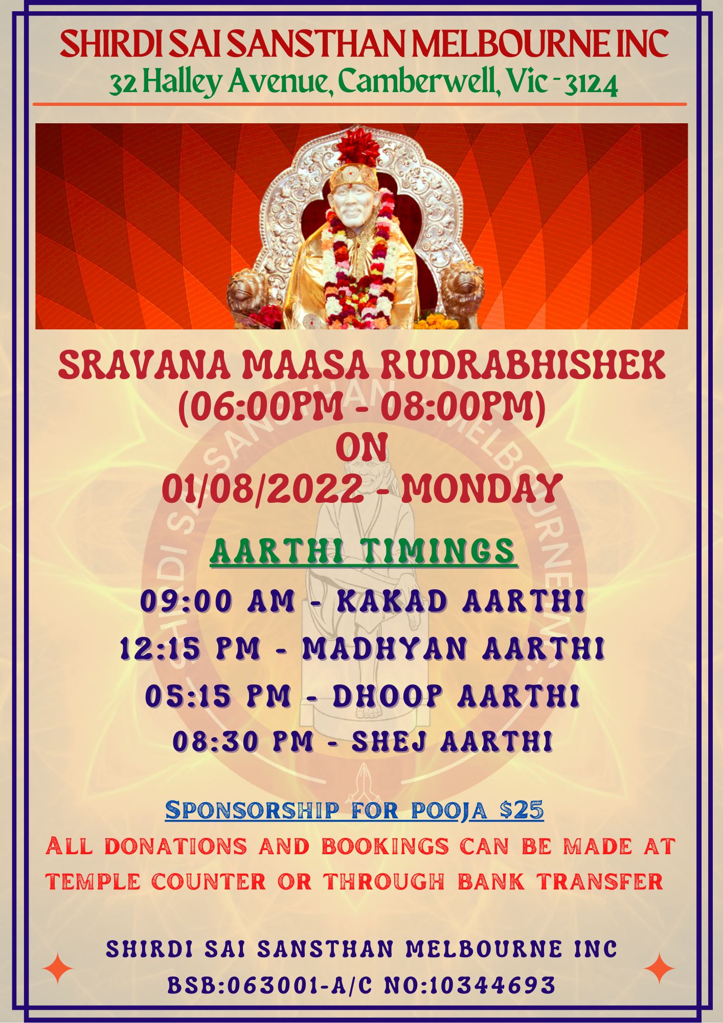 SRAVANA MAASA RUDRABHISHEK + Add to Google Calendar + iCal / Outlook export The event is finished. Date Aug 01 2022 Expired! Time 9:00 am - 8:30 pm Location Shirdi Sai Melbourne 32 Halley Avenue Camberwell VIC 3124 Share this event