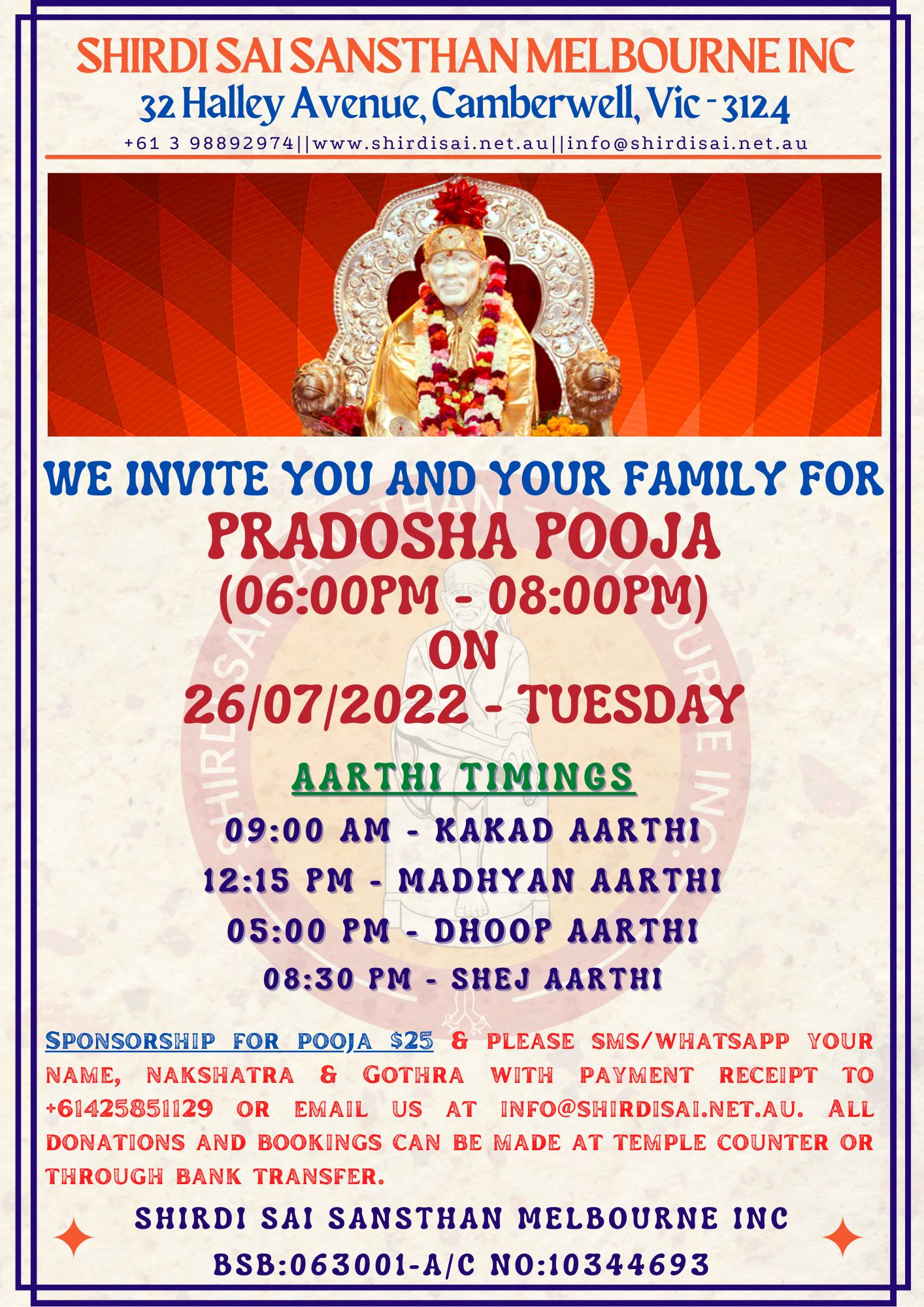 PRADOSHA POOJA + Add to Google Calendar + iCal / Outlook export The event is finished. Date Jul 26 2022 Expired! Time 9:00 am - 8:30 pm Location Shirdi Sai Melbourne 32 Halley Avenue Camberwell VIC 3124 Share this event