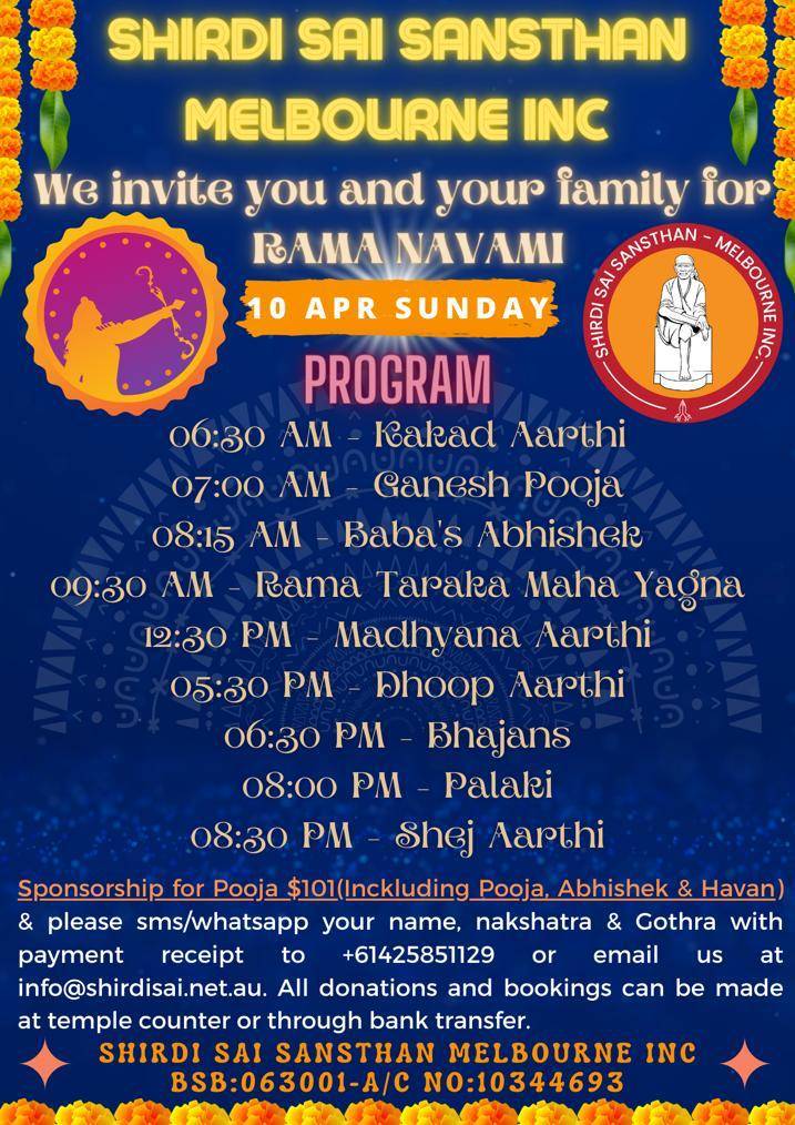 Rama Navami + Add to Google Calendar + iCal / Outlook export The event is finished. Date Apr 10 2022 Expired! Time 6:30 am - 8:30 pm Location Shirdi Sai Melbourne 32 Halley Avenue Camberwell VIC 3124 Share this event