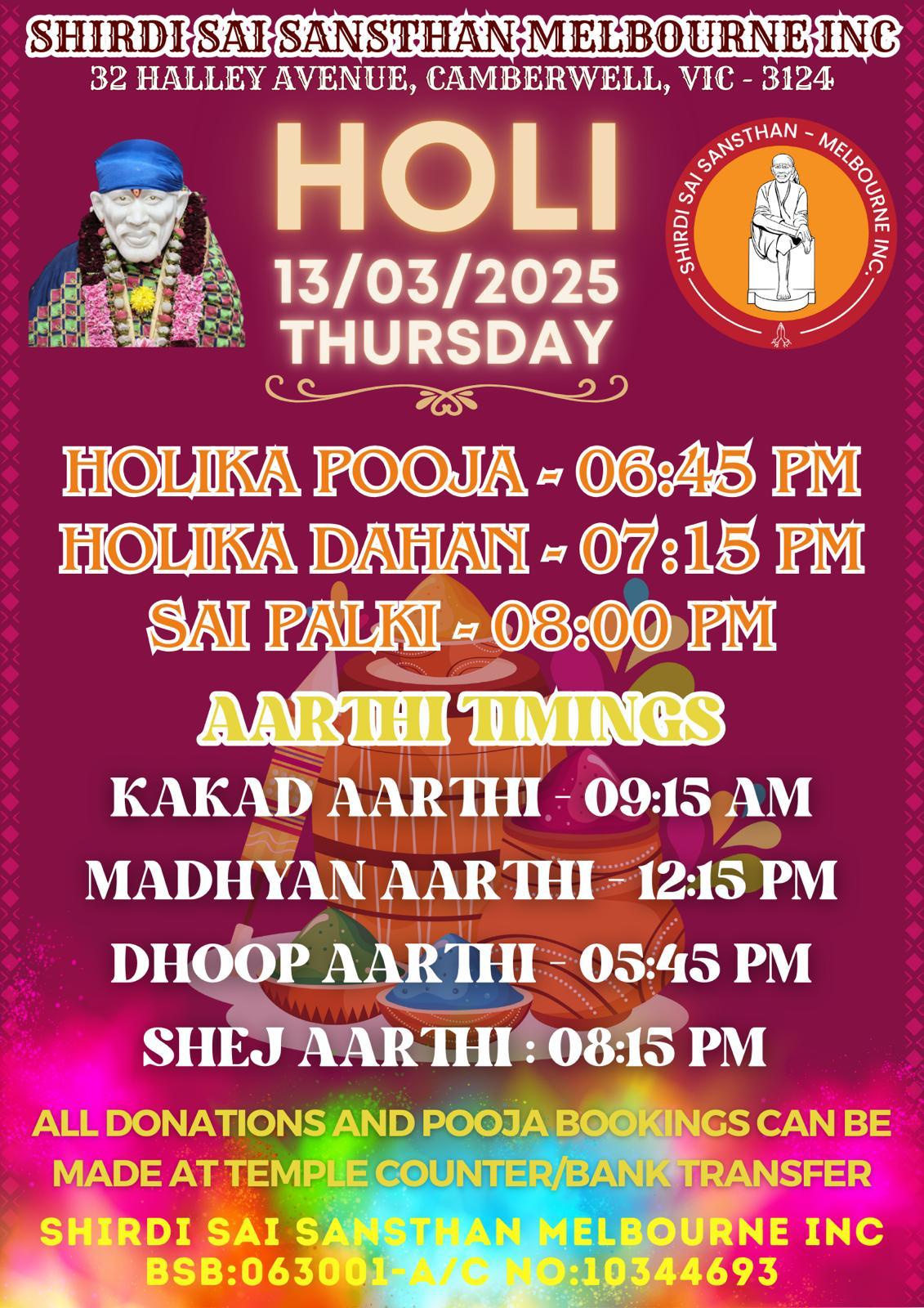 HOLI + Add to Google Calendar + iCal / Outlook export The event is finished. Date Mar 13 2025 Expired! Time 9:15 am - 8:15 pm Location Shirdi Sai Melbourne 32 Halley Avenue Camberwell VIC 3124 Share this event