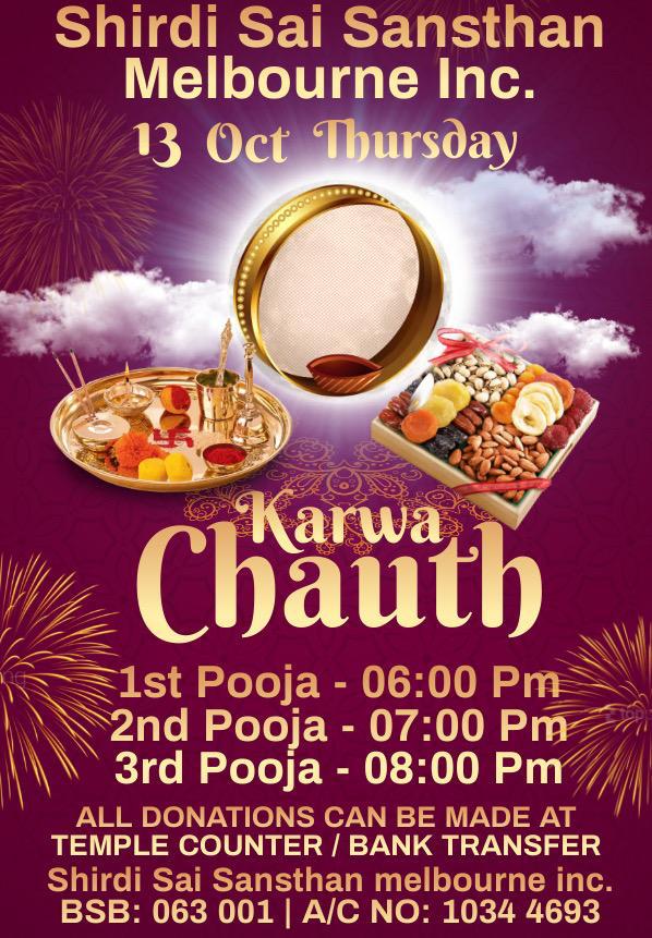 Karwa Chauth + Add to Google Calendar + iCal / Outlook export The event is finished. Date Oct 13 2022 Expired! Time 6:00 pm - 8:00 pm Location Shirdi Sai Melbourne 32 Halley Avenue Camberwell VIC 3124 Share this event
