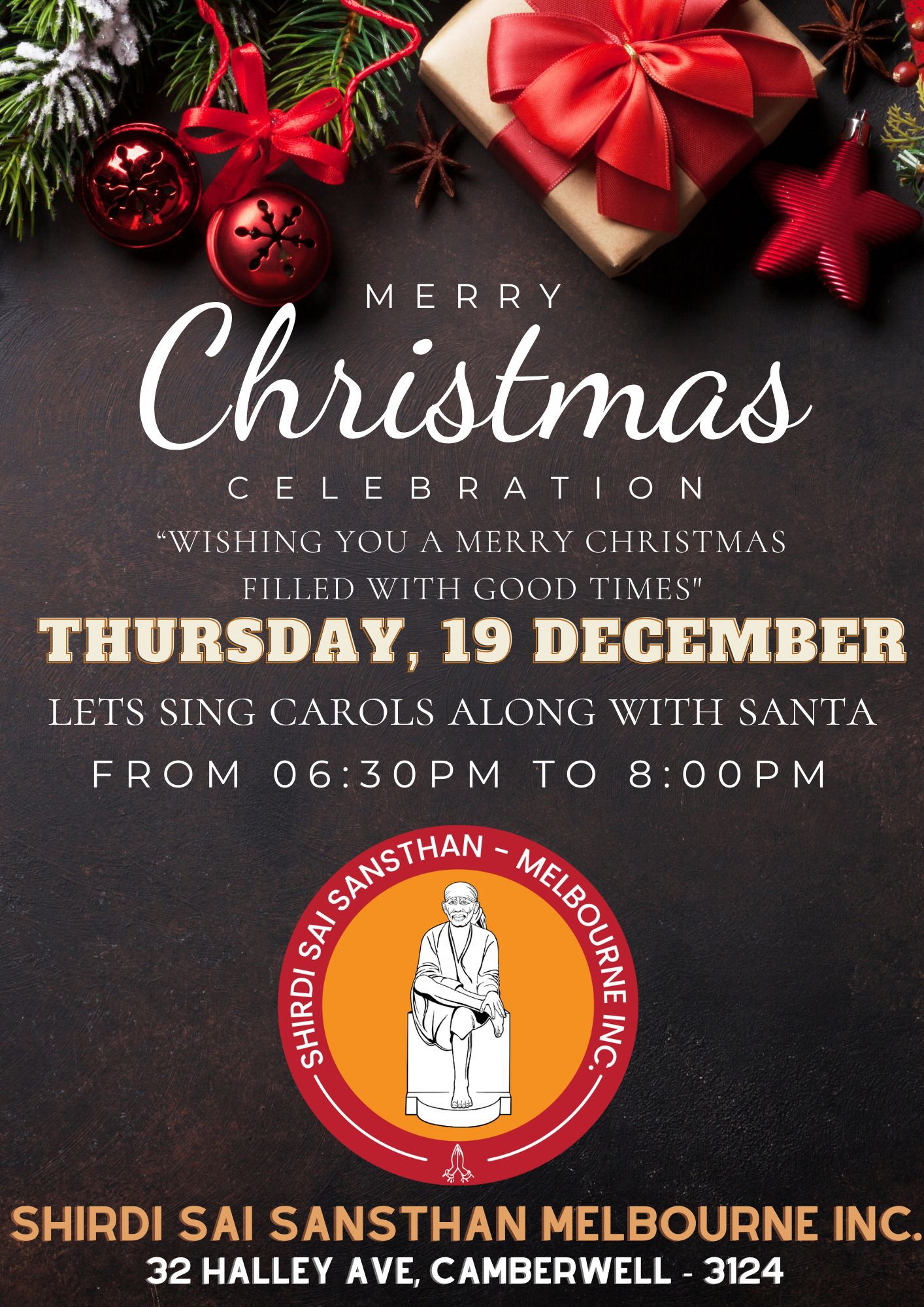 MERRY CHRISTMAS CELEBRATION + Add to Google Calendar + iCal / Outlook export The event is finished. Date Dec 19 2024 Expired! Time 6:30 pm - 8:00 pm Location Shirdi Sai Melbourne 32 Halley Avenue Camberwell VIC 3124 Share this event