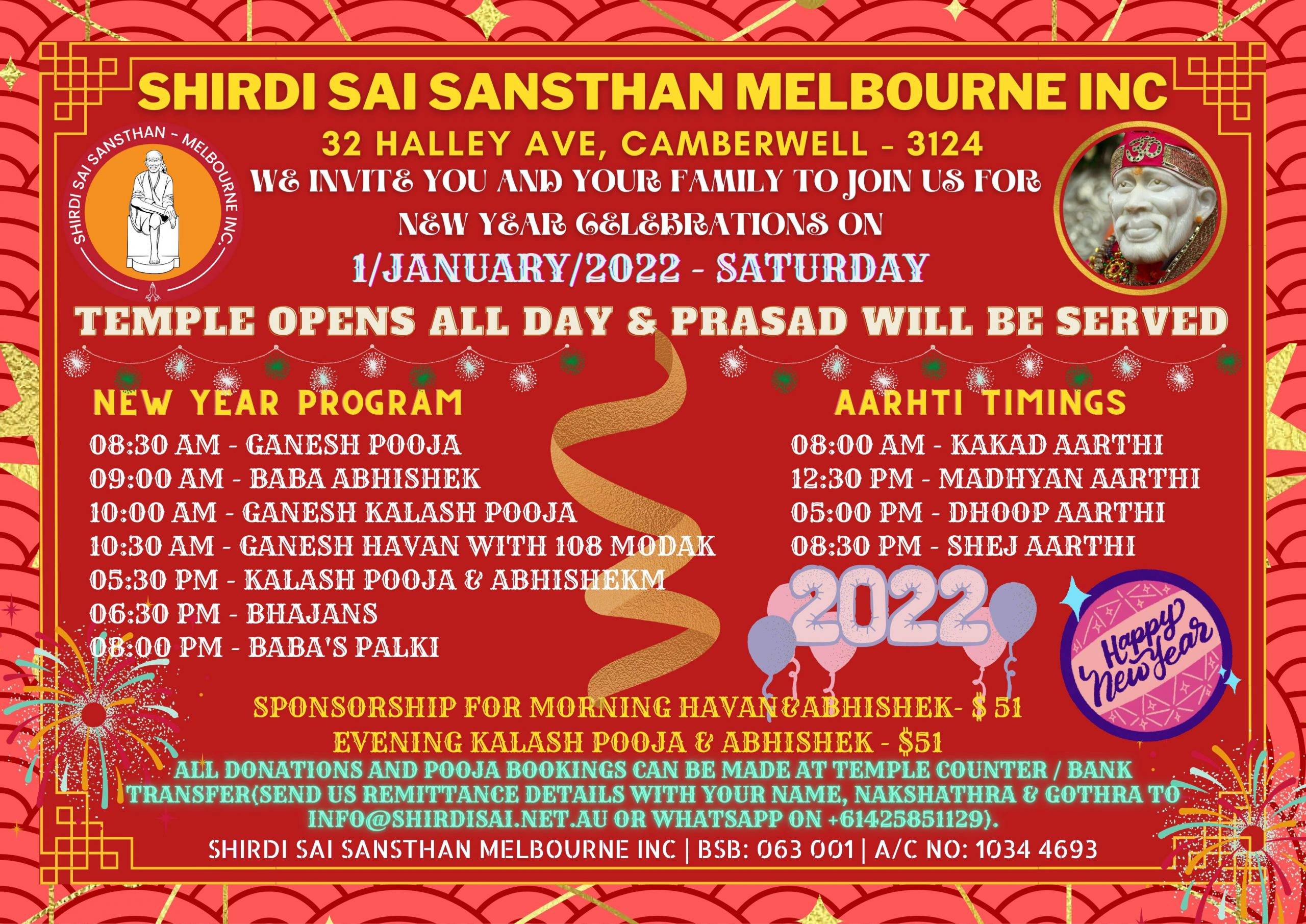 New Year Celebration + Add to Google Calendar + iCal / Outlook export The event is finished. Date Jan 01 2022 Expired! Time 8:30 am - 8:30 pm Location Shirdi Sai Melbourne 32 Halley Avenue Camberwell VIC 3124 Share this event