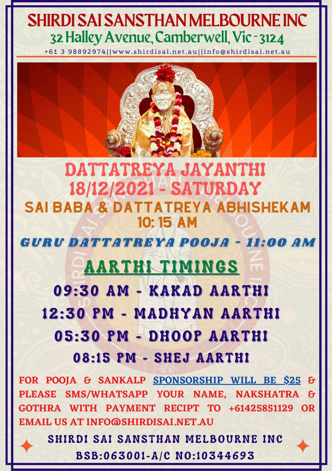 Dattareya Jyanthi + Add to Google Calendar + iCal / Outlook export The event is finished. Date Dec 18 2021 Expired! Time 9:30 am - 9:00 pm Location Shirdi Sai Melbourne 32 Halley Avenue Camberwell VIC 3124 Share this event