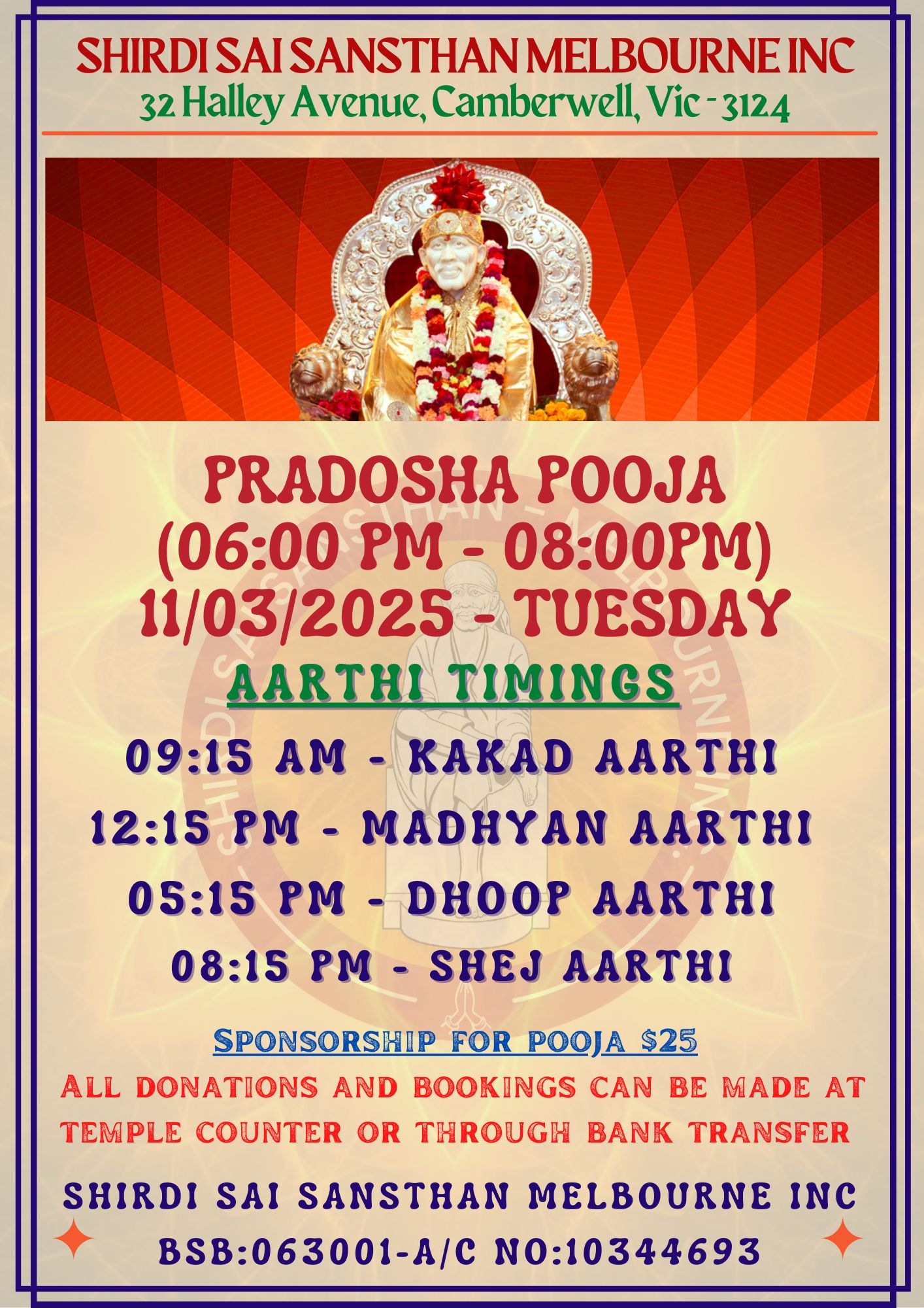 PRADOSHA POOJA + Add to Google Calendar + iCal / Outlook export The event is finished. Date Mar 11 2025 Expired! Time 9:15 am - 8:00 pm Location Shirdi Sai Melbourne 32 Halley Avenue Camberwell VIC 3124 Share this event