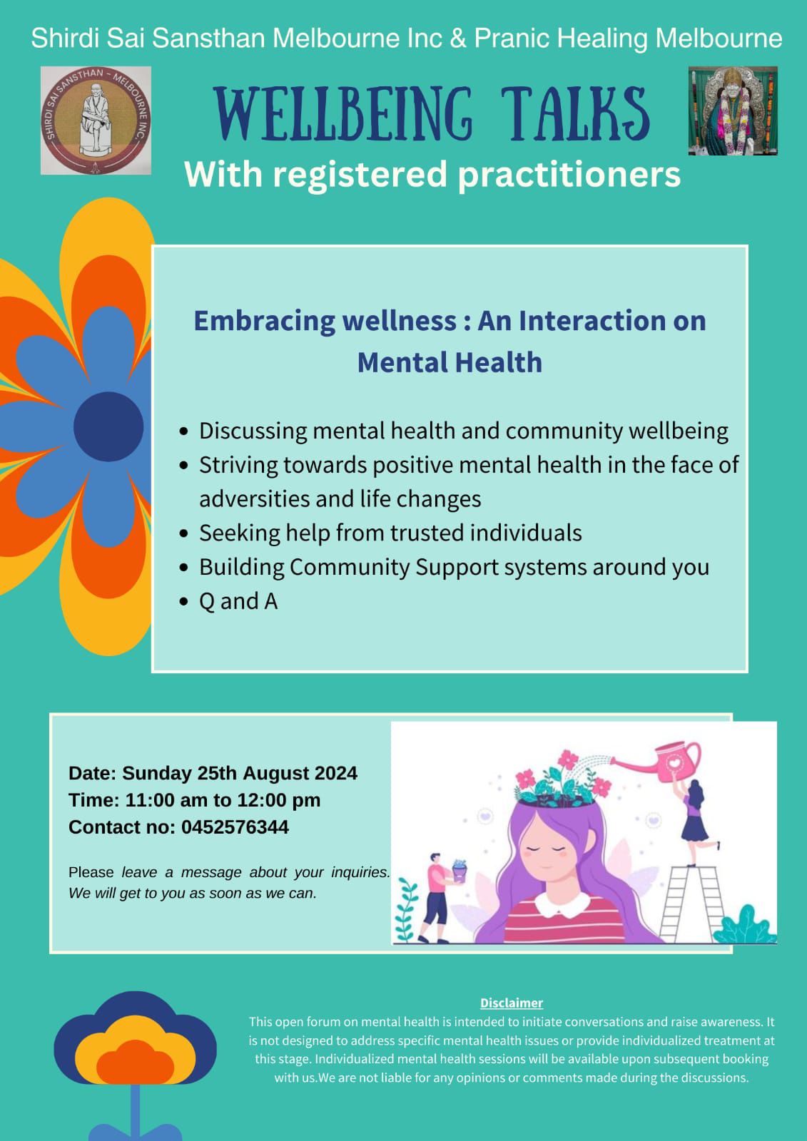 WELBEING TALKS + Add to Google Calendar + iCal / Outlook export The event is finished. Date Aug 25 2024 Expired! Time 11:00 am - 12:00 pm Location Shirdi Sai Melbourne 32 Halley Avenue Camberwell VIC 3124 Share this event